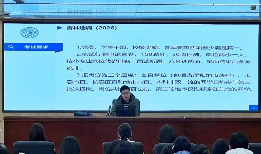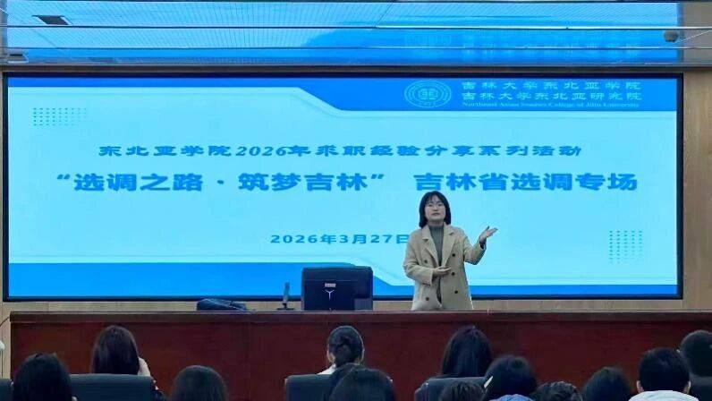 为助力同学们把握选调生动态,精准锚定备考方向,提升核心竞争力,东北亚学院于3月27日在东荣大厦B215举办2026年度求职经验分享会之吉林省选调专场。本次分享会聚焦吉林省选调及中央选调的备考策略与应试技巧,由研究生辅导员山丹老师主持,邀请三位在相关领域成绩优异的学长学姐分享实战经验,吸引了40余名研究生到场参与。山丹老师首先对三位分享人的到来表示欢迎,充分肯定了他们在专业学习与备考途中展现出的扎实功底,并对他们倾囊相授的真诚态度表示感谢。她鼓励在场同学珍惜交流机会,从学长学姐的经验中汲取养分,尽早明确目标,合理规划备考节奏。